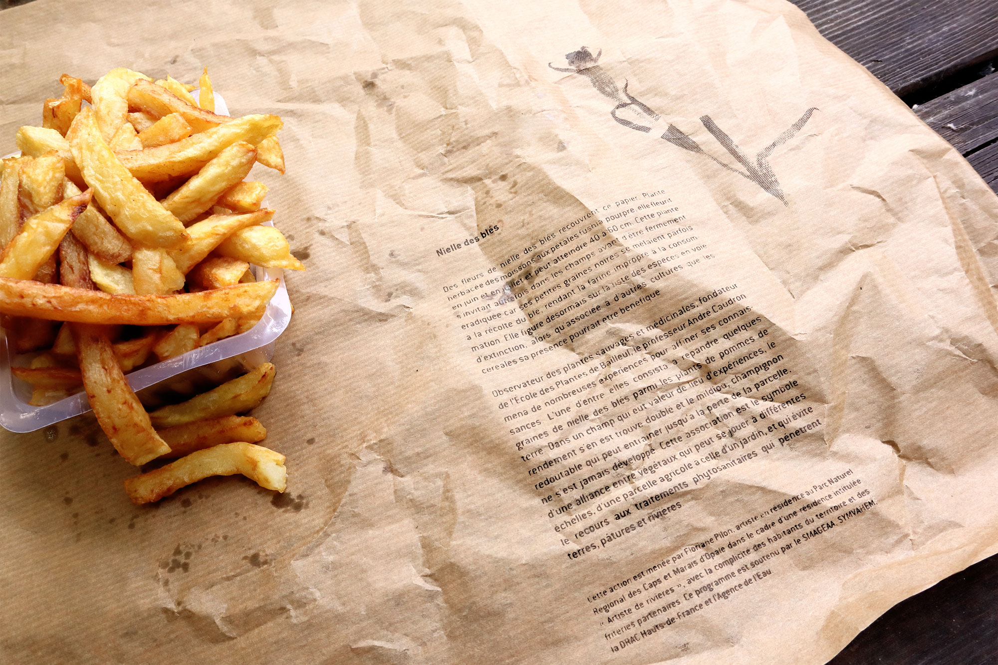 Un herbier de nielle des blés, photographié au Conservatoire des Plantes de Bailleul, est imprimé artisanalement sur des feuilles destinées à envelopper les frites dans les friteries du nord de la France. L’impression de la fleur surprend alors le client, qui, habituellement, saisit sa commande dans un papier brun vierge.